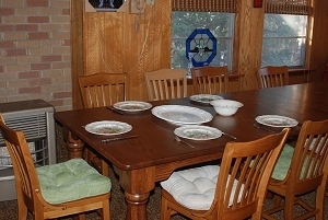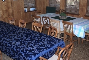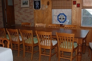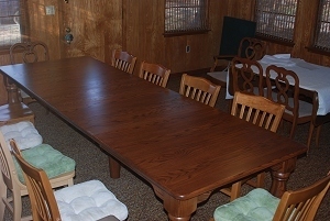Overflow table is on the right with a white cover. New Table is set up for ten, but with all leaves in. Overflow table will actually be another few inches away from the big one. There's a...um...mild difficulty when robust people are sitting back to back at the two tables and someone needs to go up the "aisle" between them. Every inch of clearance counts. (This room wasn't built for what we use it for, but if I built such a room, it would be at least 24 feet square to allow easy clearance around and between tables no matter the size of diners. And I'd probably add a few more feet lengthways to have an uninterrupted serving counter--20 feet of it--along one or both ends. But I'm very luck to have the use of this room, so not planning to tear it off and start over.)