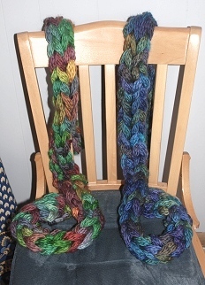 In the past 10 days, fitting in a row here and a row there (and sometimes several) between rehearsals, holiday prep, writing...I managed to finish two scarves, made with Berroco's "Link" yarn (one skein to a scarf, simple pattern with v. short rows that uses stockinette's desire to curl to make the scarf roll into a clever "rope" shape.)