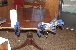 One of the two non-matching dining room tables that we put end to end to make a long one is the dining table of my childhood--it's over 60 years old. I flipped off its protective sheet and discovered that sometime in the past year it had delaminated on the underside of the leaf, leaving a flap of veneer hanging down ready to hit a guest's knee. Spouse's trip to the city allowed him to pick up some Gorilla Glue (tm) and yesterday evening we glued & clamped it in place. This picture was taken after removing some of the clamps, this morning. Yardsticks were used to brace the clamps on the end, and catalogs on the side.
