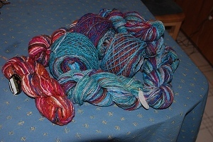 And besides. I didn't need more yarn. There is a lot of yarn around. I may not like all of it that much, but it's yarn, and it should be used before new yarn is brought in (um...like the 25 balls of yarn I bought for the new projects? Which aren't going to use that much? Yeah.) Because of various things I didn't get down to the city reasonably early (despite finishing the painting itself by 8:30 am...then came the cleaning up, and the waiting for it to dry to see if it needed a second coat, and the removal of tape, and the moving furniture back, and....) So I was hot and dry and tired when I got there...no, that's an excuse. I walked in and....this appeared when I upended a sack on the kitchen table.