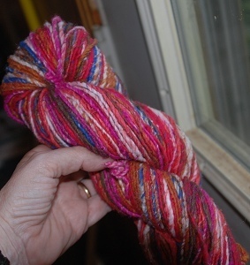 The store kindly helped me ball three of the hanks on their equipment. The ones that look orange/red are actually this color, much cooler, with hot pink in the mix: