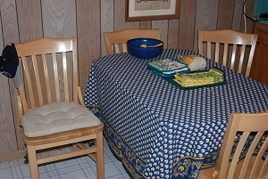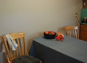 As time went by I put in new flooring (not the gold/orange/cream patterned vinyl the first owners put in, which also went oddly with the rose/gray faux-wood paneling, but a muted pattern in white/gray/grayblue. That took pressure off the turquoise countertops. But there was still the faux-wood wall. Meanwhile other stuff happened, and still other stuff happened, and finally, this year, after the 30+ years, I got real chairs into the kitchen instead of folding chairs. They went nicely with the cabinet wood, being real wood themselves. They did not go nicely with the faux-wood paneling on the wall against which they stood. Hmmm.