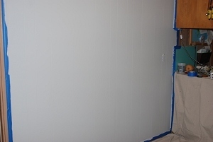 And amazingly, that was the right color. YES! So today, we have a full gallon of said paint, a new dropcloth (the old dropcloth had worn out), painters' tape, and the rest of the stuff you need to paint a wall. And tomorrow morning, when it's as cool as it ever gets in summer, so we can open the door for ventilation, i will paint that wall and never have to see the paneling argue with the cabinets again. Eventually there will be pictures.