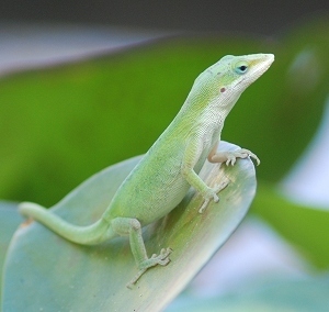 This was supposed to have been the larger version of a green anole hunting insects on waterlily pads in the pond, but the larger version wouldn't upload...so here's the small version. It was, after all, a small lizard.