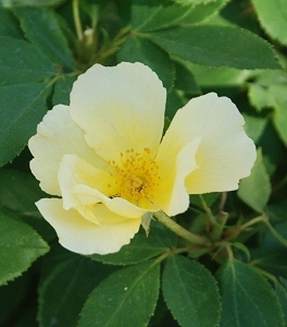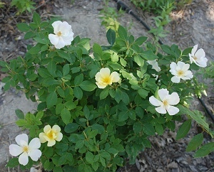 I called the garden center we've used for other things, and asked about their climbing roses--and then we went down to see. The only climbing rose they had with any real fragrance was "Don Juan"--a dark, velvety red, and not really what I wanted. In my mind's eye, that trellis is covered with soft-colored flowers. But near the "Don Juan" were some roses in pots emitting a strong fragrance of their own. The roses were covered with both yellow and white flowers. We didn't need a bush rose...exactly...but the fragrance crawled up my nose and attacked my sales resistance successfully. We drove the 20-odd miles back in a haze of scent that easily filled the car. It's a "knockout" rose that's supposed to be resistant to several of our local rose diseases and heat and drought tolerant. The buds are golden; the flowers open yellow then quickly turn white.