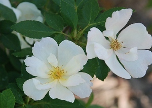 The white climber/rambler rose, though, I would never have pulled out--though it blooms only once a year, for about a week, the fragrance is incredible. The flowers form terminal trusses of small, single white, from pink buds, and I will stand in the driveway for a long time just to smell them. It seemed to like what we did for it...until the oaks grew. Dense oak shade it does not like. Over the years, as the oaks got taller and produced more shade, it declined.