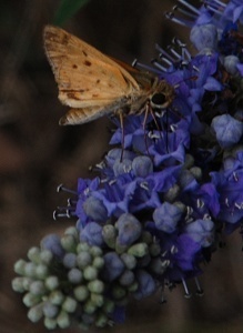 On the other, Naturalist-Cartographer just acquired a GPS to define locations where something was found or photographed. To practice, I went out back and marked some spots where I know I'm likely to take pictures...and found the chaste tree in bloom, and a cloud of Fiery Skippers, Hylephila phyleus, around it and some nectaring on the flowers.