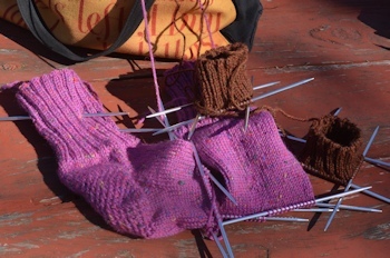 Two pairs are now on the needles: a brown-heather pair begun when the previous medium blues came off the needles, and a pair I started last night.