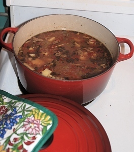 The 3.5 LeCreuset (pictured last week) is a fine little pot for a family meal, but not really big enough to make a company meal, or let me package some for friends. So now the 5.5 quart has joined it. Here it is on its first run, this afternoon/evening, with another "concoction stew" in it: