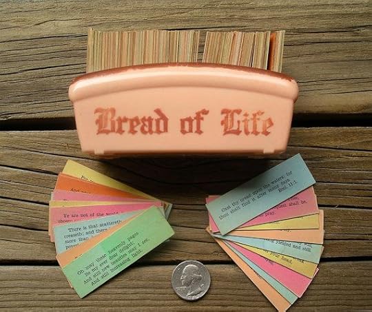 The other thing I remember about her room was her letting me play with the little plastic "Bread of Life" container that held small different-coloured cardboard pieces with a Bible verse on each one. She kept it on the lower shelf of the night table next to her bed, and she likely read one each day. I spent hours taking out the cards, reading the verses, and carefully organizing them.