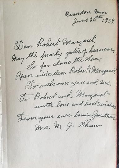 When I read that inscription a few days ago, I was floored. I'd read it before, but never connected it to the fact that this was an inscription to her son and his bride, or to the fact that my dad always used R. A. Shaw, and before I was married, my signature was N. J. Shaw before it became N. J. Lindquist. Mom's signature was O. Margaret Shaw, although she sometimes skipped the "O."