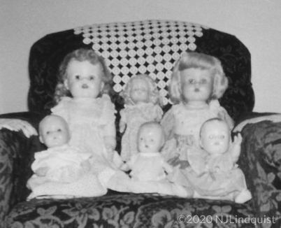 I have no idea what the names of the other dolls in this photo were, but Mom said I had a Judy, a Donna and a Mary. When I was nine or ten, I got a Tiny Tears doll which might be in the front row, but I'll tell you more about it later.