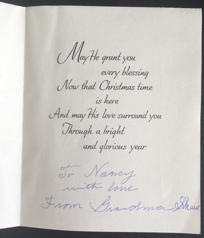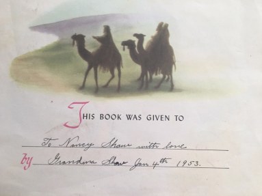 I’m guessing we drove to either Brandon or Winnipeg for a few days around Christmas time, unless we stayed home because I was sick. According to my Baby Book, I was sick for my birthday, which is right after Christmas, so we “celebrated quietly.” Granny Shaw sent me a book, Aunt Margaret and Uncle Albert sent dress hangers, and others sent cards. Mom and Dad gave me a book, some candy and skates.