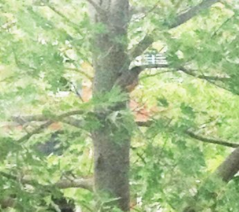 The two adults took turns bringing worms to the babies and keeping watch out front, either in a tree, on our post, on the ground, or on either our roof or that of our neighbour to the right.