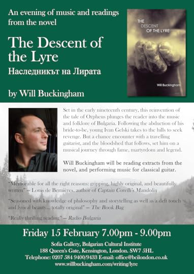 This is just a quick post to point visitors to some information about the up-coming event I’m planning at the Bulgarian Cultural Institute in London, where on the 15th February I’ll be reading from and discussing my novel, The Descent of the Lyre, and playing some music for the classical guitar — a mixture of pieces by Fernando Sor and arrangements of Bulgarian folk tunes. It should be a fun evening, all are welcome, and you can find more information on my events page.