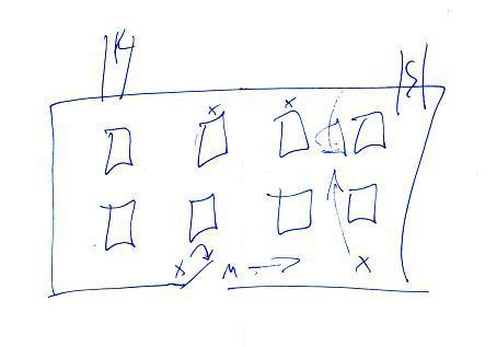 The top one is for the scene I mentioned in a previous post, the face-off between Mirage and the four Thornbloods who jump her in the common room of an inn. The letters identify the combatants, in their opening positions; M is Mirage, X are the Thornbloods. The exterior door is in the bottom wall; upper left marks the exit to the kitchen, and upper right marks the staircase. The eight things vaguely resembling rectangles are tables. At this late remove, I can't say for sure, but I think the scribble above the arrow coming off that lower right X represents the wet patch of floor and bucket of soapy water Mirage kicks over later in the fight.