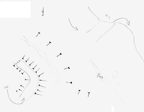 With the second map, I got fancier; I blame the fact that I wrote the related scene right after getting back from an archaeological field school, and I had topography on the brain. This is a chase scene, where Mirage et al. get ambushed by a group of Cousins, and all those little cuneiform marks are me telling myself in which direction the slopes are angled when the horses go charging off the road. I think the bit in the upper right corner is me doing a cross-sectional view of that bend in the road. Not a fight, per se, but as physical action it has many of the same practical requirements.