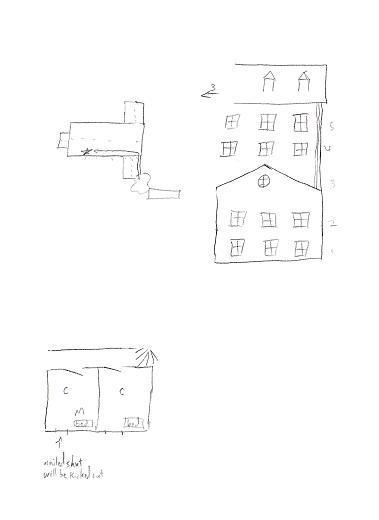The third map is the house in which Miryo is imprisoned, and I created it to plan Mirage's assault. Again, we have a cross-sectional view, this time so I can keep track of where Mirage is climbing; then there are two floor plans, with an M for Miryo and C's for a pair of Cousins.