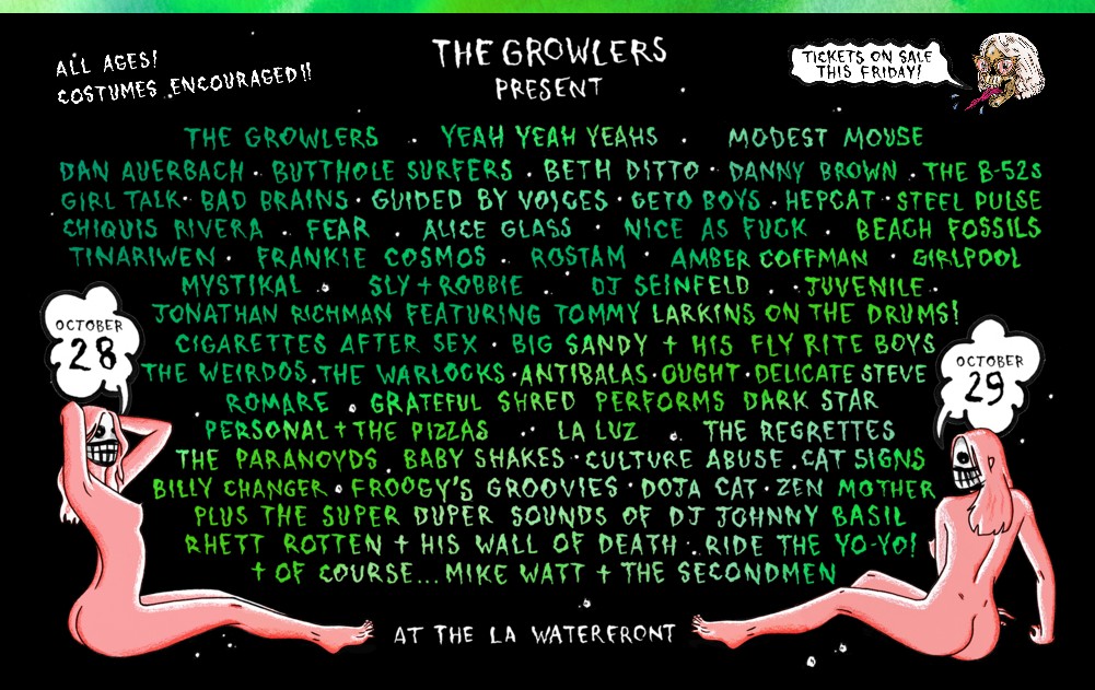 FULL LINEUPThe Growlers (Both nights!)Yeah Yeah YeahsModest MouseDan AuerbachButthole SurfersBeth DittoDanny BrownThe B-52sGirl TalkBad Brains, Guided By Voices Geto BoysHepcatSteel PulseChiquis RiveraFearMike Watt & the SecondmenAlice GlassNice As FuckBeach FossilsTinariwenFrankie CosmosRostamAmber CoffmanGirlpoolMystikalSly + RobbieDJ SeinfeldJuvenileJonathan Richman featuring Tommy Larkins on the DrumsCigarettes After SexBig Sandy + his Fly Rite BoysThe WeirdosThe WarlocksAntibalasOughtDelicate SteveRomareGrateful Shred performs Dark StarPersonal & the PizzasLa LuzThe RegrettesThe ParanoydsBaby ShakesCulture AbuseCat SignsBilly ChangerFroogy's GrooviesDoja CatZen MotherDJ Johnny Basil