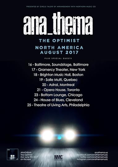 April 17, 2017, Liverpool, UK – Anathema, who recently revealed the new song “Sprinfield” (https://youtu.be/8y1ROzCUpbU), from the band’s forthcoming album, The Optimist (June 9, Kscope), are now thrilled to announce their first North American dates since 2014.