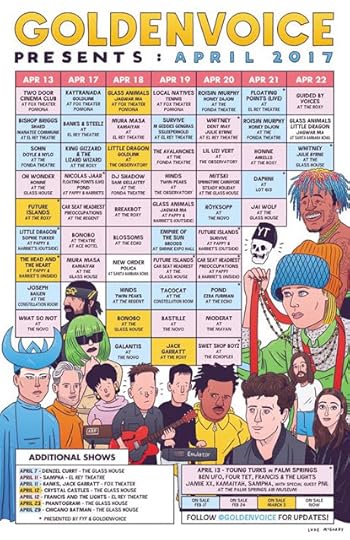 FYF PRESENTS4/7 - Denzel Curry at the Glasshouse - on sale 2/174/13 - Young Turks in Palm Springs with Jamie XX, Four Tet, and more at the Palm Springs Air Museum - on sale 2/174/13 - Future Islands at the Roxy - on sale 3/34/13 - Little Dragon, Sofi Tukker at Pappy & Harriet's - on sale 2/174/13 - The Head & The Heart at Pappy & Harriet's - on sale 3/34/17 - Nicolas Jaar, Floating Points, Pond at Pappy & Harriet's - on sale 2/244/19 - Glass Animals, Jagwar Ma at Pappy & Harriet's - on sale 2/244/19 - Future Islands, Car Seat Headrest at Glasshouse - on sale 2/244/19 - S U R V I V E, M Geddes Gengras, SSLEEPERHOLD at the El Rey - on sale 2/174/20 - Swet Shop Boyz at the Echoplex - on sale 2/244/20 - POND, Ezra Furman at the Echo - on sale 2/174/20 - Car Seat Headrest, Preoccupations at Pappy & Harriet's - on sale 2/244/20 - Future Islands, S U R V I V E at Pappy & Harriet's - on sale 2/244/20 - Whitney, Dent May, Julie Byrne at El Rey - on sale 2/244/21 - Floating Points (Live) at El Rey - on sale 2/174/21 - Daphni at Lot 613 - on sale 2/174/22 - Whitney, Julie Byrne at the Glasshouse - on sale 2/17For ticket information and the complete list of FYF shows, visitfyfpresents.com. A full list of the April shows can be found here.