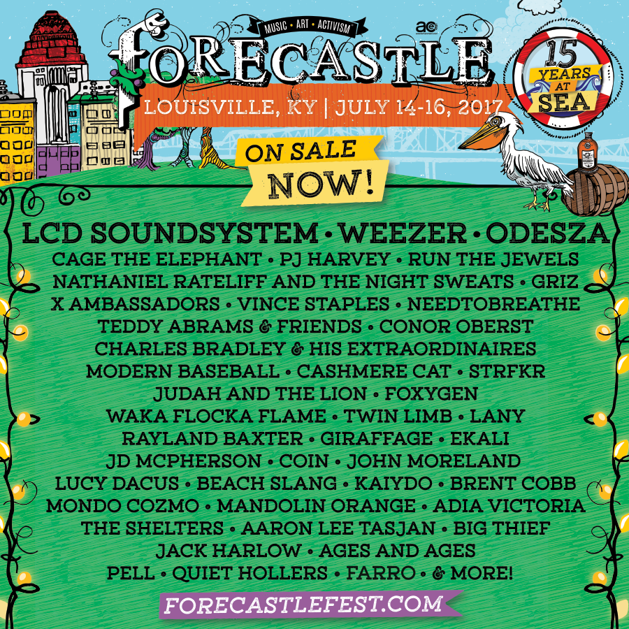 LOUISVILLE, KY (December 6, 2016) - Embarking on its 15th year, the Forecastle Festival will return in 2017 led by celebrated dance rock legends LCD Soundsystem, alt-rock royalty Weezer, and the infectious grooves of electro-pop duo Odesza. The three-day music celebration will take place July 14-16, 2017, at the award-winning Waterfront Park, situated on 85 acres of green space on the banks of the Ohio River framed by the skyline of downtown Louisville. Additional acts include Cage the Elephant, PJ Harvey, Run the Jewels, Nathaniel Rateliff and the Night Sweats, GRiZ, X Ambassadors, Vince Staples, NEEDTOBREATHE, Teddy Abrams & Friends, Conor Oberst and many more. A full list of confirmed artists from the initial lineup can be found below. A number of additional acts will be announced in early 2017.