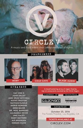 Los Angeles, CA (August 29, 2016) - On Saturday, October 23, thousands of festivalgoers will gather in Hollywood at the historic Fonda Theatre for the inaugural Circle V music festival, celebrating animal rights and benefiting international animal protection nonprofit Mercy For Animals. Longtime animal activist Moby will headline the festival produced by Goldenvoice (Desert Trip, Coachella) in his only LIVE performance this year, alongside Blaqk Audio and Cold Cave. In the spirit of the festival, Moby & The Void Pacific Choir are releasing their new animal rights video, Don't Leave Me - http://moby.la/mobyvpcdontleaveme.Special celebrity guests will include Kat Von D (LA Ink) and pro NBA player John Salley.Says Moby (co-founder of the festival along with Tony Kanal and Mercy For Animals), "Circle V is the coming together of my life's work, animal rights, and music. I couldn't be more excited about this event and am so proud to be headlining."An all-day, all-vegan food extravaganza curated by Eat Drink Vegan and featuring some of the best-known and beloved chefs and trucks in Los Angeles will precede the music. Speakers, including the most respected and acclaimed voices in animal rights, will also be a part of the festivities. Kip Andersen and Keegan Kuhn, directors of Leonardo DiCaprio's climate change documentary, Cowspiracy, will lead a panel discussion of the environmental impacts of animal agriculture; Mercy For Animals' president, Nathan Runkle, PETA founder Ingrid Newkirk, and famed ultramarathoner and author Rich Roll will also speak. Date: Saturday, October 23, 2016Time: 1-6 pm Speakers and Food 7-11 pm ConcertLocation: The Fonda Theatre, Hollywood (6126 Hollywood Blvd, Los Angeles, CA) All proceeds from ticket sales will benefit Mercy For Animals, whose mission is to prevent cruelty to farmed animals and promote compassionate food choices and policies. Mercy For Animals' groundbreaking undercover investigations and legal advocacy initiatives have led to landmark criminal and civil prosecutions of factory farms, new and stronger animal protection laws, the defeat of whistleblower-suppression bills, and policy changes that improve animal welfare and consumer protections. "Circle V is more than a music festival; it's a movement," says Nathan Runkle, president of Mercy For Animals. "By spotlighting vegan food, speakers, and artists, we hope this event inspires and empowers people to take action to make the world a kinder place for animals."Circle V believes that a future in which animals are granted basic rights is possible if we all act today. Tickets to the festival are $10 for 1-6pm speakers and food or $59.50 all inclusive day event + concert.