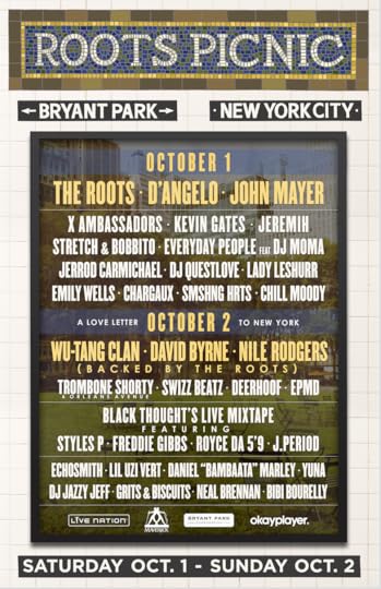 ROOTS PICNIC TO EXPAND INTO NEW YORK CITY ON OCTOBER 1 & 2 IN BRYANT PARK The Roots, D'Angelo, John Mayer Headline October 1The Roots, Wu Tang Clan, David Byrne, Nile Rodgers Headline October 2 Kevin Gates, X Ambassadors, Trombone Shorty, Swizz Beatz,Echosmith and More To Perform - Special 2-Day Early Bird Ticket Offer - - Tickets On Sale Friday, June 10 at 10:00 AM -