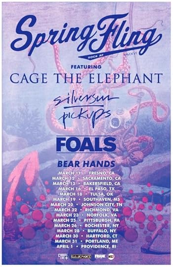 LOS ANGELES, CA - JANUARY 11, 2016 - This March, Cage The Elephant, Silversun Pickups,Foals, and Bear Hands will embark on Spring Fling Rock AF 2016. The 15-city U.S. arena tour packages some of the best and brightest names in alternative music today, and harkens back to the days when artists crisscrossed the country together on package tours - often hitting cities and towns that otherwise wouldn't have access to live music from so many artists at one time. Spring Fling Rock AF 2016 kicks off in Fresno, CA on March 11, 2016 at Save Mart Center and will wind down on April 1st in Providence, RI at Dunkin' Donuts Center in Providence, RI - also hitting markets such as Sacramento, CA, Tulsa, OK, Buffalo, NY, and more along the way. Tickets for Spring Fling Rock AF will be available for purchase beginning this Friday, January 15th at 10:00 AM local time. Spring Fling Rock AF is produced by Frank Productions and Goldenvoice.
