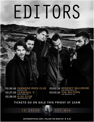 In Dream has seen Editors gather praise for an uncompromising and stark artistic statement, leaving behind the straight rock of previous album 'The Weight Of Your Love' . It is the second album to feature the "new" line-up of the band with Justin Lockey and Elliott Williams firmly in place alongside founding members Tom Smith, Russell Leetch and Ed Lay. After two years of global touring this five piece incarnation used the new album to stretch the Editors sound, swerving away from the rock dynamic of "The Weight Of Your Love" and marking a return to a writing process influenced by electronic music. In Dream is out now via Play It Again Sam and available to buy digitally and physically.You can catch Editors stunning live show when they play the dates below.US TourFeb 26 - Boston, MA - Paradise Rock ClubFeb 27 - New York, NY - Terminal 5Feb 28 - Washington, D.C - 9:30 ClubMar 2 - San Francisco, CA - Regency BallroomMar 3 - Los Angeles, CA - The Wiltern