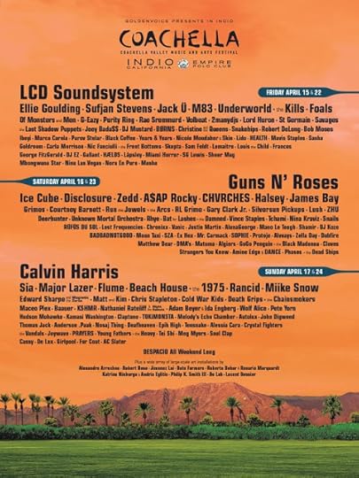 We already knew Guns N Roses (Axl and Slash included) and LCD Soundsystem would be reuniting for Coachella 2016 , and now the full lineup is here. It also includes Sufjan Stevens, M83, Ice Cube, Disclosure, A$AP Rocky, Courtney Barnett, Grimes, Run the Jewels, Lush, Deerhunter, The Damned, The Kills, Foals, The Front Bottoms, Savages, Joey Bada$$, HEALTH, Mavis Staples, Vince Staples, Beach House, Rancid, Chris Stapleton, Death Grips, Kamasi Washington, Deafheaven and many more. Full lineup above, and larger text HERE.