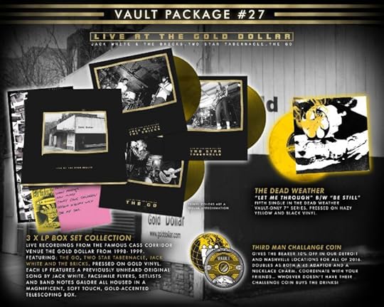 highlights the momentary period before the band had signed to Sub Pop and was still honing material for its Whatcha Doin album. Opening with a blistering take on their anthemic "Meet Me at the Movies" and closing with powerful version of the Sonics' classic "Psycho", the smell of sweat and Stroh's permeates this recording. Aside from a radio session and an underwater audience recording, this is the only live document of how intense this line-up of the Go was. With band mainstays Bobby Harlow, John Krautner and Marc Fellis helming their usual positions, Dave Buick (Italy Records, Third Man Cass Corridor) is on bass and Jack White is on lead guitar. Included here is a live take on White's "Turn Your Little Light Bulb On" a song penned for the Go that has remained relatively unheard in the intervening eighteen years. The Go are essential in understanding Detroit rock history and this, their first live release, cements their place in the pantheon. Opening for Royal Trux on September 16th, 1999, Jack White and the Bricks were actually never called that name during their brief existence across a half-dozen (or so) shows. We've reproduced the flyer proclaiming "Jack White Band" to prove it. While Vault Package #15 showcased a live recording of the Bricks that left a lot to be desired in regards to fidelity, the multitrack masters from the Gold Dollar were available to create a truly stellar mix here. From Brendan Benson's harmonic accents (on both vocals and guitar) to Kevin Peyok's even-keeled bass runs, through Ben Blackwell's competent drum work...the performance here is sublime. If you've ever daydreamed about hearing Jack tackle White Stripes songs with the attack of two guitars behind them...this show will delight. Divergent interpretations of Stripes' catalog staples "Candy Cane Children" and "You've Got Her in Your Pocket" do not disappoint. The otherwise unreleased Jack White song "One and Two" is particularly fascinating. Rounded out with a cover of Little Richard's "Ooh! My Soul" (which may be an inspiration for "Fell in Love With a Girl") and what exists here is the definitive document of this outfit. Each LP comes in it's own custom stylized jacket and will be housed in a soft touch telescoping box highlighting the Gold Dollar building. Keep 'em in the box or file 'em away in your individual band sections in your record collection...whatever you want! Vinyl pressed on our non-metallic approximation of gold vinyl.The box will be filled up with all sorts of facsimile reproductions of setlists, flyers, band ephemera and material the likes of which fans have come accustomed to expecting in the unrivaled Vault packages. For our 7" offering in this package...we continue along the path of Dead Weather Dodge and Burn with the electrifying "Let Me Through" backed with the frightening "Be Still." Housed in a tasty glue-pocket sleeve and pressed on the hazy mix of yellow and black vinyl, this further solidifies the idea that the Dead Weather are as equally as deadly on single as they are on LP. If you've got the first four of these, you can't tap out now. Collect the whole series. The bonus item in Vault #27 is a custom Third Man Records Challenge Coin. Usually used as totems to signify membership in a military organization, challenge coins are slowly making their way into other realms of culture. The Third Man Records 2016 Challenge Coin will entitle its bearer to 10% off any purchases in our Detroit or Nashville store fronts for the duration of this year. It will also double as a large hole 45 adaptor. If you want to wear it on a chain around your neck, hell, we won't stop you. And if you want to "challenge" your Vault member friends to see who's holding theirs with any empty-handed folks buying the next round of drinks...well that's just the kind of camaraderie we hope to foster amongst our most loyal and die-hard fans. We're hoping to make this a continuing feature of each year's first Vault package, so get in now on the ground floor. These coins will not be made available at a later date, so if you want to be able to prove inclusion (and not be on the hook for any drinks) you absolutely need to sign up for Vault Package #27. And if you want to sign up for more than one... we won't mind. Subscriptions for Vault package 27 close on January 31st. Sign up today. For more information about the Gold Dollar visit golddollar.com