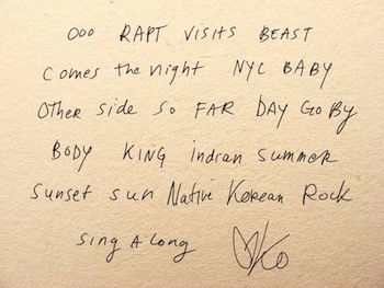 1. Ooo2. Rapt3. Visits4. Beast5. Comes the Night6. NYC Baby7. Other Side8. So Far9. Day Go By10. Body11. King12. Indian Summer13. Sunset Sun14. Native Korean Rock15. Singalong
