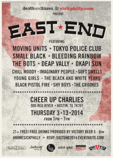 Death and Taxes, curator of some of the best-loved social content on the web, along with VisitPhilly.com, is elated to announce the 4th Annual "East End," taking place March 13th, 2014 at Cheer Up Charlies in Austin, TX. This year the daylong multi-stage event will feature performances from Tokyo Police Club, Moving Units, The Crookes, Small Black and many more. As always, the event is free and open to the public. RSVP here.