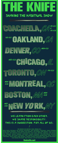Adena Asovic (Perfomer), Aja Svensson (Performer), Halla Ólafsdóttir (Performer), Jesper Strömbäck Eklund (Project Manager), Josefin Hinders (Set Designer), Julia Brightly (FOH Engineer), , Karin Dreijer (Performer), Kim Einarsson (Artistic Coordinator), Laura Davis (Monitor Engineer), Lotje Horvers (Tour Manager), Marcus Baldemar (Performer), Maryam Nikandish, (Performer), Mickey Hurcombe (Backline Tech), Miguel Gutierrez (Performer, Deep Aerobics), Olof Dreijer (Performer), Peter Hamilton (Production Manager), Rami Jawhari Jansson (Performer), Sarah Landau (Light Designer), Shannon Funchess (Performer), Stina Nyberg (Performer), Tarek Halaby (Performer, Deep Aerobics), and Zoë Poluch (Performer) The Knife N.American Tour Dates: 4/11-Coachella Music Festival-Indio, CA4/15—Fox Theater—Oakland, CA (on-sale Friday 1/17 @ 12 PM PST)4/18-Coachella Music Festival-Indio,CA4/21-Fillmore-Denver, CO4/23-Aragon-Chicago, IL4/25-Kool Haus-Toronto, ONT4/26-Metropolis-Montreal, QUE4/28-House of Blues-Boston, MA4/30-Terminal 5-NYC