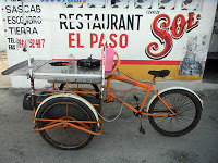 Tricyclos are a common sight in much of Yucatán Peninsula, as they are in Asia, Africa, South America and other parts of the two-thirds world. In the United States you mention a tricycle and people think of Monty Python or Laugh-In. In the global south they are multifunctional and ubiquitous. You see them as fishermen's friends, beach-roving gear-buckets for surfers, portable crepe parlors, bellhop cabin service, and the poor man's moving van.
