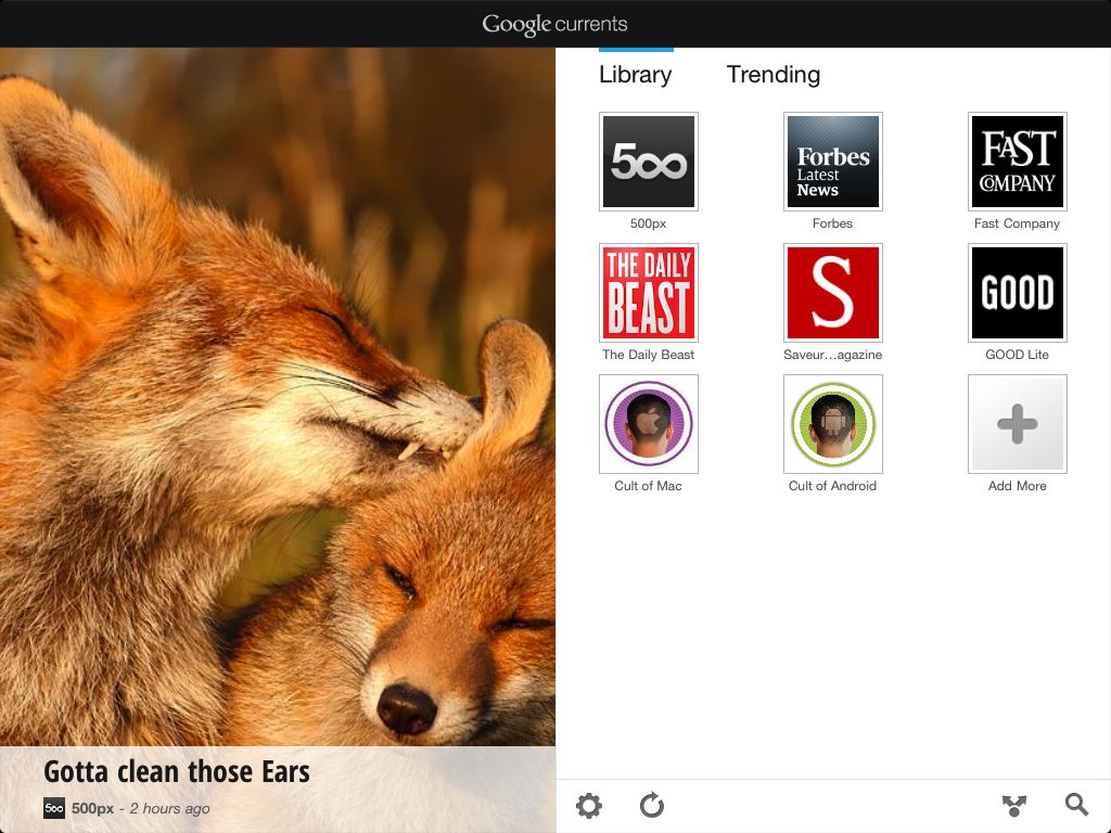 Google trending editions – Google Currents uses Google search technology to hourly build a set of editions tracking the five most recent trending stories in categories such as world, entertainment, sports, science, and more. Each story is presented through a fresh edition of articles, videos, and pictures,