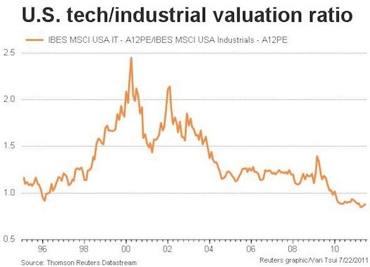 How to explain the fact (via Kevin Drum) that industrial companies are now valued more aggressively than tech companies?