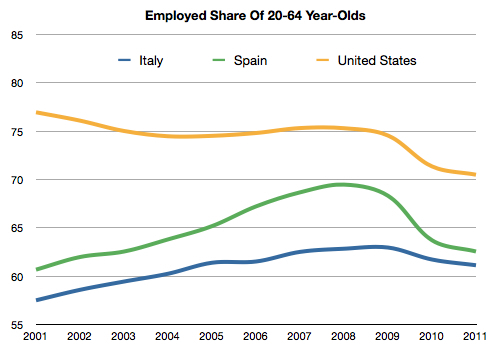 Note that the European Union doesn't so much as publish data on the 20-64 employment-population ratio. But fortunately Matt Cameron was able to piece it together for a few key countries based on the breakouts the OECD tracks. Here's a comparison of the United States with Italy and Spain:
