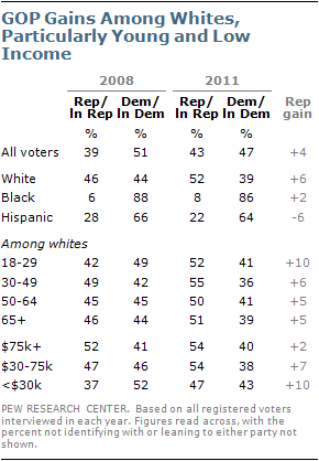 The latest Pew data on party identification shows scenario two playing out with Republicans losing ground among Hispanics but posting strong gains with white voters: