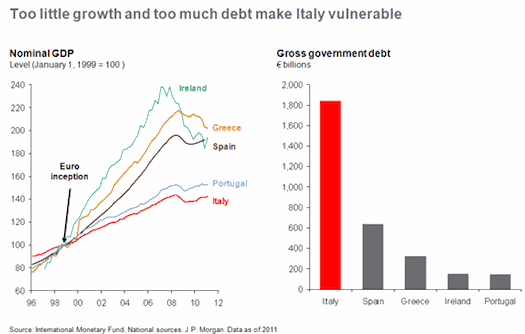 I think it's worth just plowing straight forward and looking at Italy, the largest and allegedly least-troubled of the PIIGS. This from JP Morgan is very instructive: