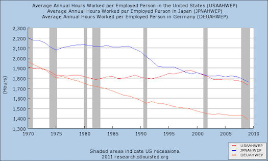 I think it's sensible of the Germans to have taken a lot of the gains from their increased productivity in the form of reduced working hours. But if you look at the German line in detail, you see a cyclical element. Each time a recession ends, it's associated with an uptick in hours worked. That's because you do recover specifically from a recession through an increase in the demand for labor that expresses itself first in longer hours and then in less unemployment. Then, in Germany at least, the underlying trend toward less work and more leisure comes back into play.