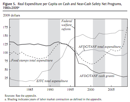Relative to the issue above, I wonder if there's evidence that tax-and-transfer programs really have become politically unsustainable in a neoliberal era? There are probably lots of different ways you could look at this issue, but at a minimum this paper from Marianne Bitler and Hilary Hoynes (PDF) on what actually happened after welfare reform suggests that there actually hasn't been much change in total fiscal commitment: