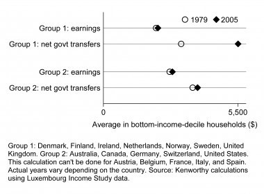 Another way of looking at this is internationally. According to Lane Kenworthy, market incomes for the poor have stagnated across the developed world, but in some countries transfer payments have risen and living standards increased:
