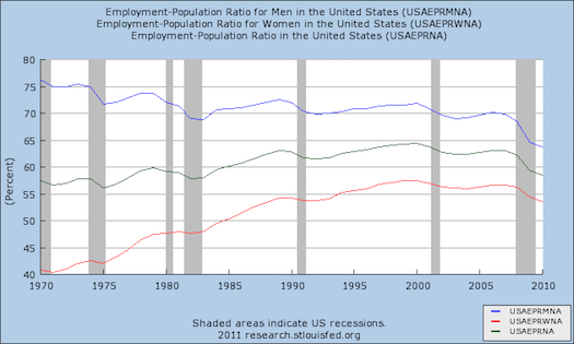 For a long time, women's employment has been rising while the trend has been for men's employment to fall. Up until 2000, the rate of women's increase was faster than the rate of men's decrease, so the overall trend was up. But since the demise of Pets.com, we've been on a downward trend. What's not clear is to what extent that trend is purely an artifact of the current downturn versus to what extent it may reflect an actual reversion to a pre-1990s equilibrium. From a progressive feminist point of view, we're presumably looking for men's and women's labor force participation to converge over the long run. But I'm not sure there are any obvious ideological grounds on which to favor convergence at one particular level over another.