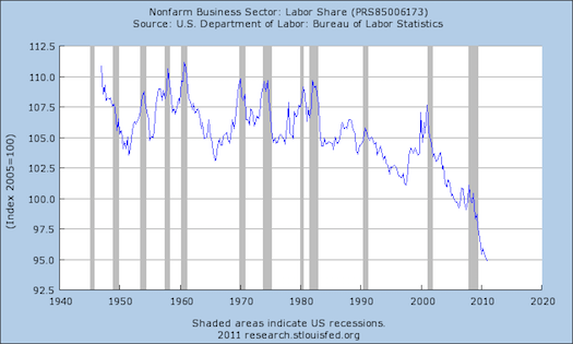 Of course Democrats should address it as well. I see two concurrent things happening here. One is the failure of policymakers to manage the business cycle adequately. The labor share of national income is a highly cyclical phenomenon. When a recovery from a recession begins, what happens is that firms have market opportunities and low labor costs. That leads to high profits, which lead to new investments, which reduces the unemployment rate. Then when the unemployment rate is low, the labor share of income grows. In the period before the 2001 recession when we had full employment, the labor share of income was healthy. Had the elites charged with management of macroeconomic policy succeeded in maintaining full employment, we wouldn't have this problem.