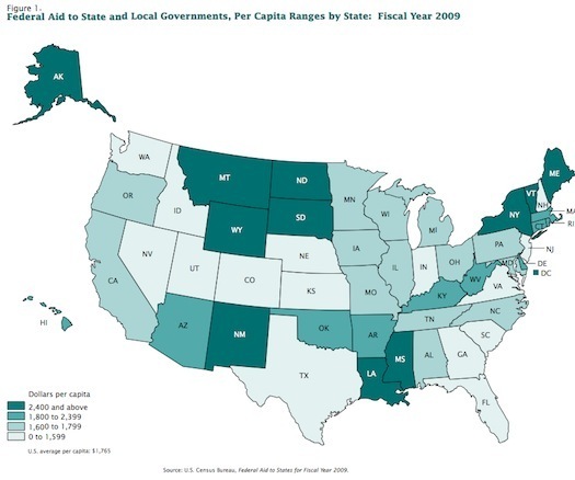 The big losers here are poor states (Mississippi), states with enormous Medicaid costs (New York), and what I take to be a block of tiny states who've leveraged their overrepresentation in the Senate (South Dakota, North Dakota, Montana, Wyoming, Vermont) into generous subsidies. Of course, the details really matter here. Medicaid is almost half of federal aid to state governments, so if that's somehow preserved, the distribution of the impact could end up looking quite different.