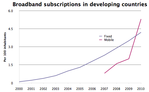 Cecilia Kang writes about how for many low-income Americans, the smartphone and mobile broadband plan are the primary means of internet access. What's interesting is that this is even truer if you look at the global poor. Matt Cameron threw together the relevant datasets from the International Telecommunications Union and offers this chart: