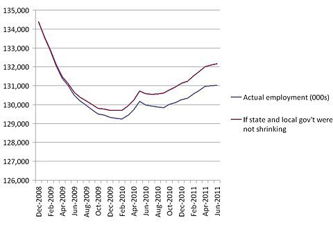 And this, I think, tends to understate the issue. As I've been saying for some time now, on housing we've now undershot on the low side. At one point, we stopped building new homes because we had plenty of homes. Now we're still not building homes even though the population has grown plenty because too many people can't afford to go out and live in one. But if we had these extra million state and local workers that Leonhardt's talking about, several hundred thousand of them would be occupying currently non-existent homes and we'd have less construction unemployment. What's more, all those employed construction workers and librarians and firemen would be shopping at stores and eating at restaurants. That would mean more cashiers, more cooks, more truck drivers, etc.