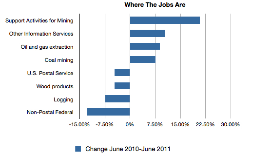 Other Information Services includes "publishing and/or broadcasting content exclusively on the Internet," thus bloggers such as myself are in good shape along with people engaged in various forms of mining. Federal workers and people engaged in wood-related activity are, by contrast, shedding jobs.